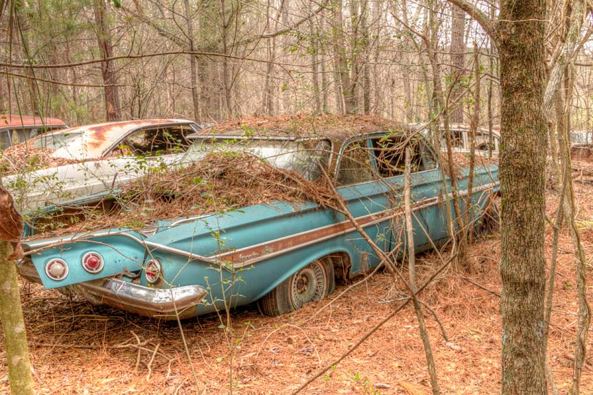 Em meio a uma densa floresta encontramos OLD CAR CITY, localizado em White no estado da Georgia nos Estados Unidos. Tudo isso começou em 1931 como uma revenda de peças usadas, mais conhecido como ferro velho, o que foi tomando um vulto tão grande, e hoje é o local com maior número de carros abandonados no mundo.